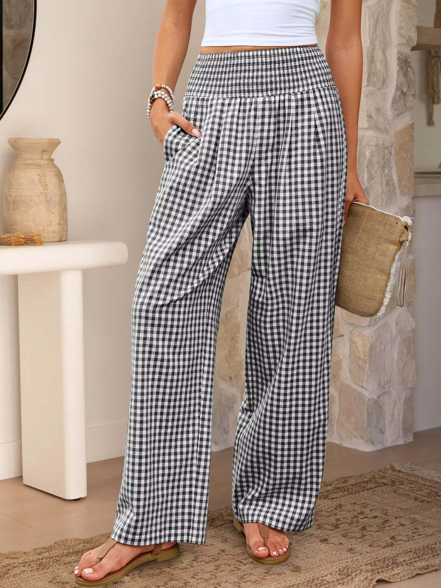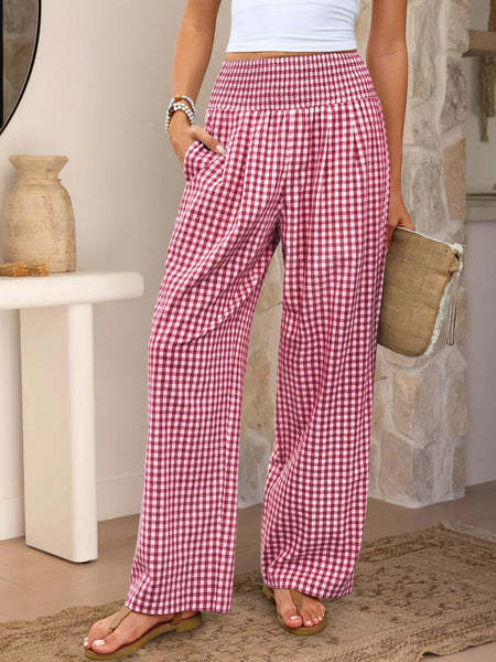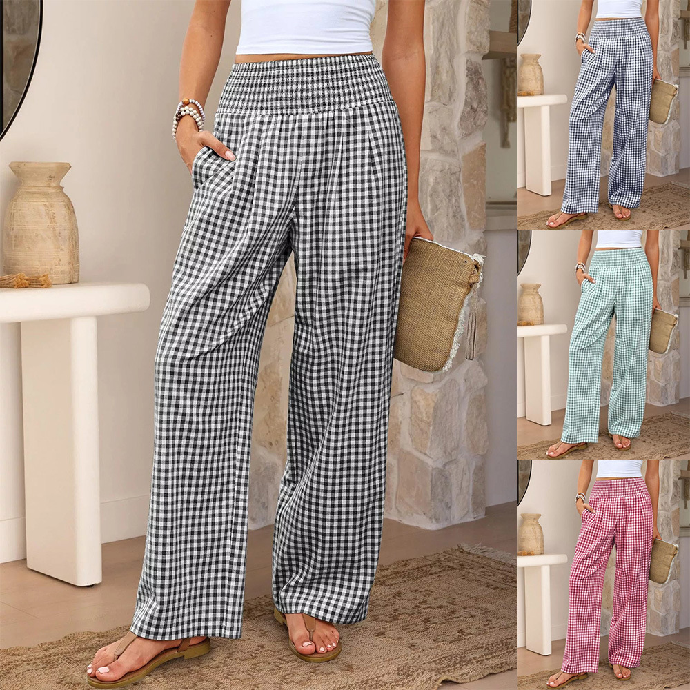 Plaid Casual Trousers Loose-fit Womens Fashion Wide-leg Pants With Pockets
